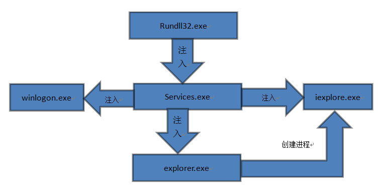 此次瑞星公司公布的病毒分析報(bào)告顯示,“超級(jí)火焰”病毒的主體為一個(gè)名為MSSECMGR.OCX的DLL動(dòng)態(tài)庫(kù),通過(guò)命令行“rundll32.exe MSSECMGR.OCX, DDEnumCallback”來(lái)實(shí)現(xiàn)病毒的加載。病毒運(yùn)行后會(huì)將自身復(fù)制到System32目錄下,并向services.exe、winlogon.exe、explorer.exe和iexplore.exe等程序中注入自身并實(shí)現(xiàn)加載。該病毒的注入流程如下圖所示。